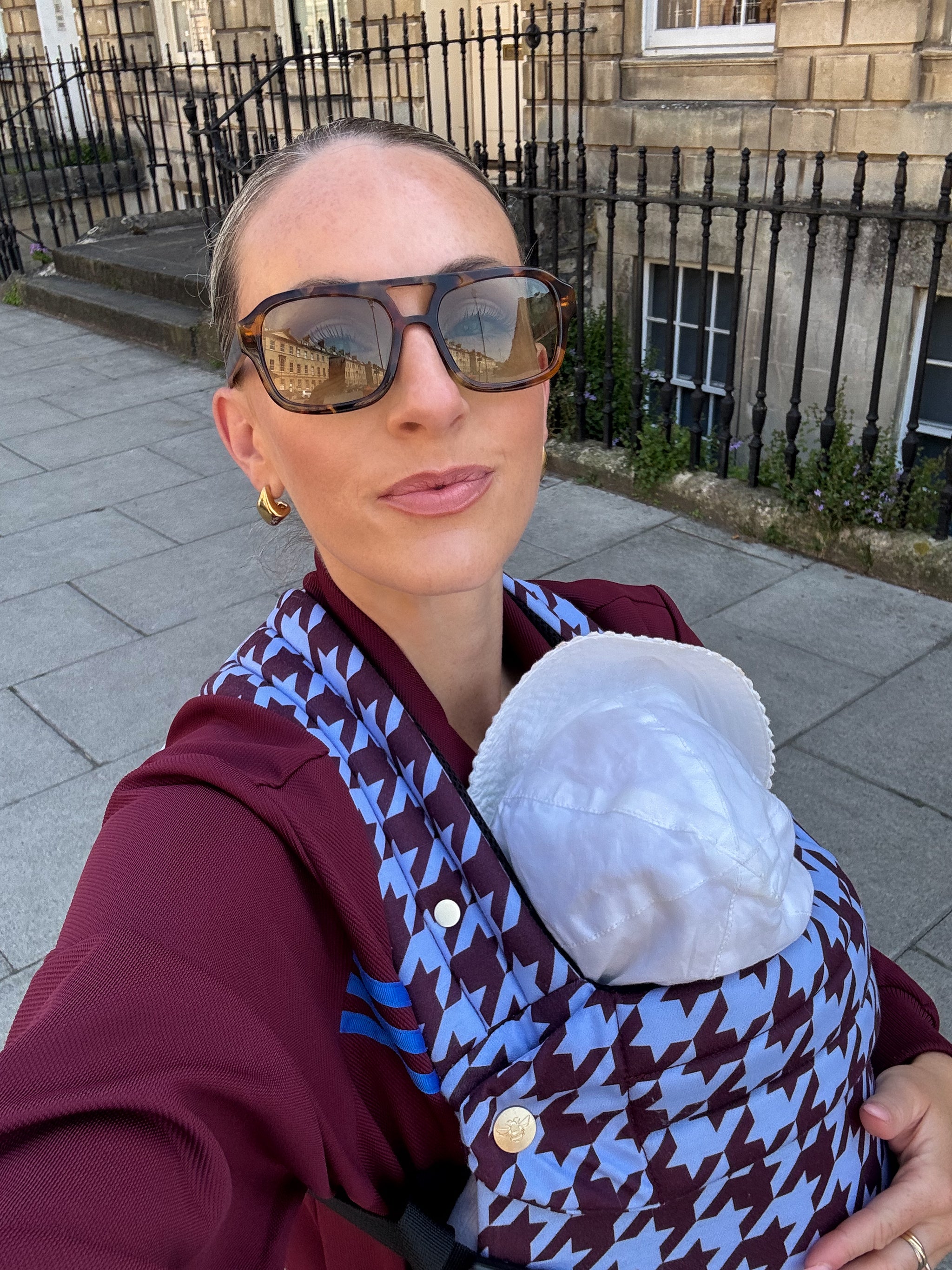 The best way to carry baby is parent facing either at the front or on the back when baby is older.