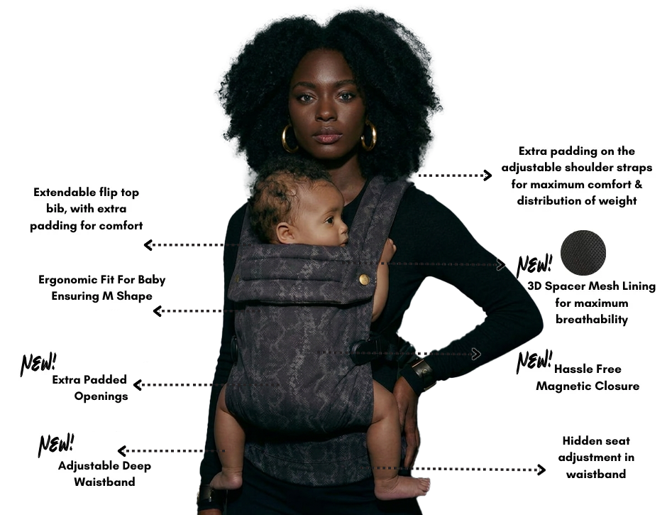 Serpentine - is our newest baby carrier, featuring a sleek snakeskin- inspired print for a bold, modern look. Designed for comfort, support and everyday style, it keeps your baby close while making a statement.