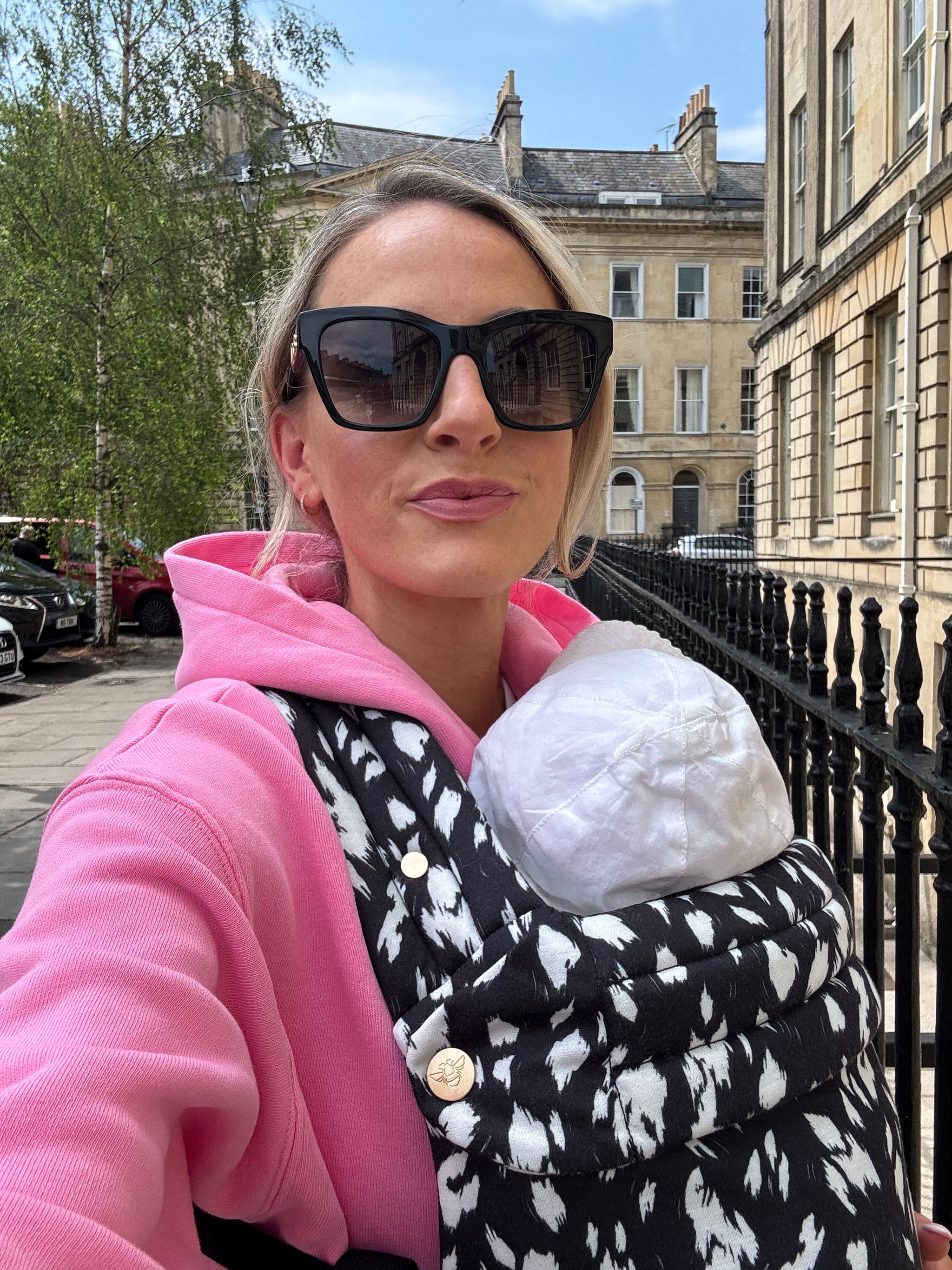 The best way to carry baby is parent facing either at the front or on the back when baby is older.